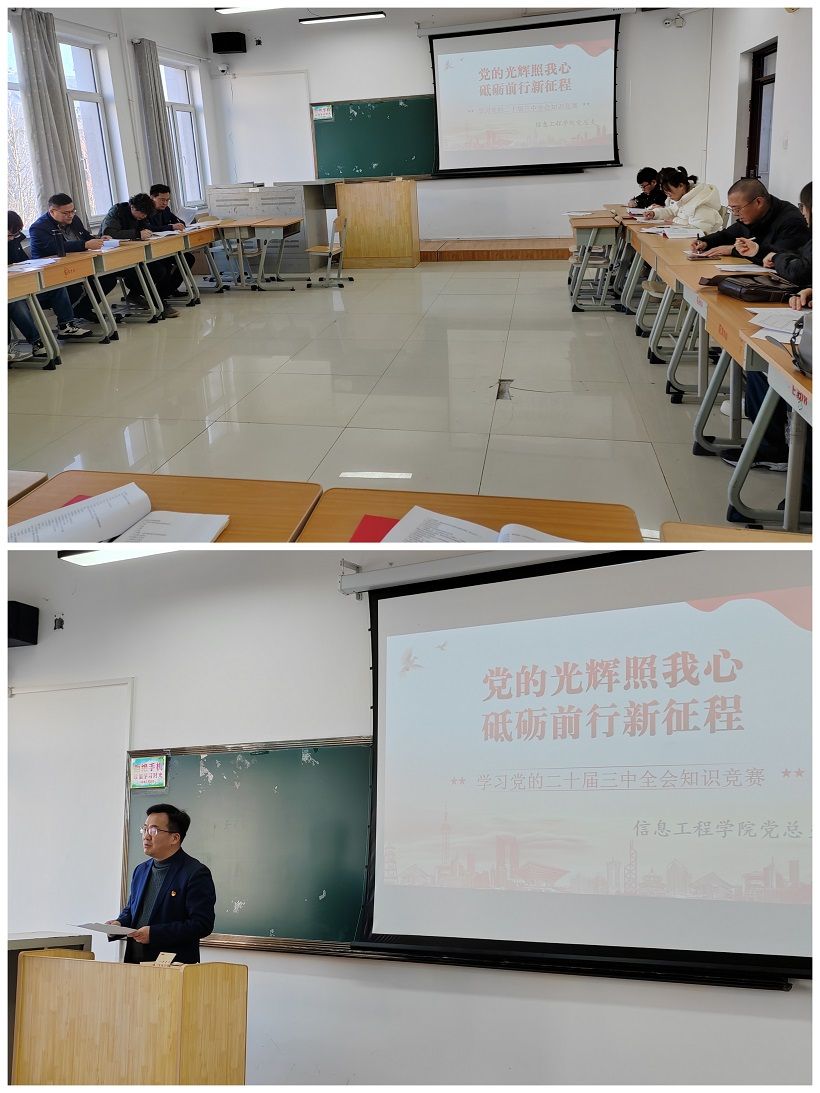 12月4日,信息工程学院党总支开展了“党的光辉照我心,砥砺前行新征程”学习贯彻党的二十届三中全会知识竞赛主题党日活动,此次活动由信息工程学院党总支书记姜东洋主持,全体党员参加了知识竞答活动。