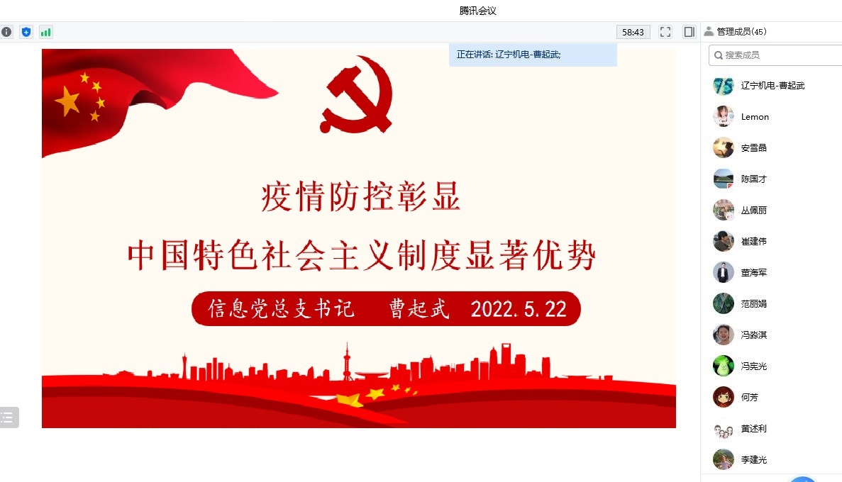 按照学院党委工作安排,结合校园疫情防控工作需要,2022年5月22日晚上18:40,信息工程系党总支书记曹起武利用“腾讯会议”平台开展了疫情防控专题党课——疫情防控彰显中国特色社会主义制度显著优势,信息工程系全体教师参加了党课学习。