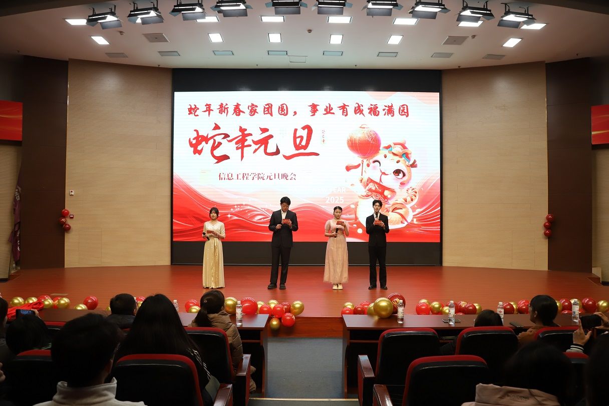 在2024年12月30日晚,以“青春践行二十大,筑梦奋进新征程”为主题的信息工程学院元旦晚会,在学校报告厅如期举行,吸引了全信息学院和其他院系的师生,大家欢聚一堂,共同迎接充满希望与挑战的新年曙光。本次晚会由信息学院分团委精心策划并主办,携手校体育教学部、校团委大学生艺术团、校融媒体中心及校易班发展中心等多方力量,历经一个多月的匠心筹备,最终为全院师生呈现了一场视觉与听觉的双重盛宴。