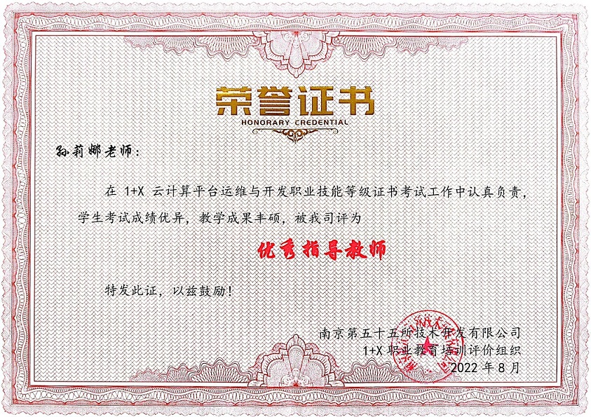 由全国工业和信息化职业教育教学指导委员会、中国软件行业协会职业教育产教融合专业委员会指导,全国云计算大数据职业教育集团主办,南京第五十五所技术开发有限公司承办,国基北盛(南京)科技发展有限公司协办的全国云计算大数据职业教育集团2022学术年会暨职业教育创新发展研讨会日前在内蒙古呼和浩特成功召开,会上我院获得“全国职业教育优秀校企合作单位”、“1+X云计算平台运维与开发优秀试点院校”和“1+X云计算平台运维与开发优秀讲师”三项荣誉称号。